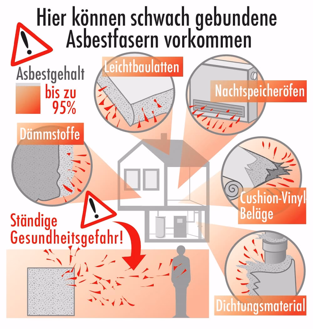 Die Gefahr geht von freigesetzten Asbestfasern aus, die eingeatmet werden können. Bei intaktem, fest gebundenem Asbest ist das Risiko der Faserfreisetzung gering, solange das Material nicht beschädigt oder bearbeitet wird. Schwach gebundener Asbest kann jedoch konstant Fasern abgeben und stellt ein höheres Risiko dar.