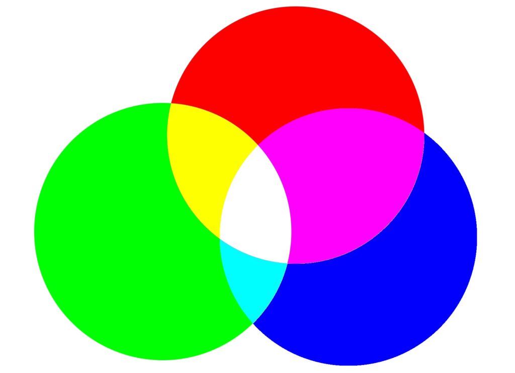 Wenn die drei Primärfarben Rot, Grün und Blau in unterschiedlichen Kombinationen und Helligkeiten addiert werden, entstehen verschiedene Farbeindrücke. Hier sind die grundlegenden Ergebnisse: