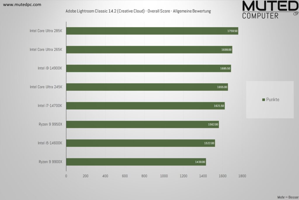 Bei Prozessoren derselben Generation und Architektur ist eine höhere Taktfrequenz in der Regel besser, da einzelne Aufgaben schneller bearbeitet werden können. Wenn eine Anwendung nur wenige Kerne nutzen kann, ist die Taktfrequenz der wichtigste Faktor. Bei Anwendungen, die sehr gut parallelisieren (wie Lightroom Export), ist die Anzahl der effizient nutzbaren Kerne wichtiger, aber eine gute Taktfrequenz bleibt auch hier vorteilhaft.