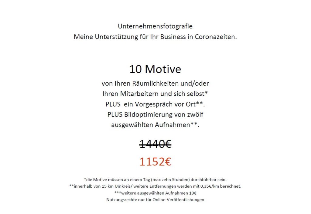 - Extras: Listen Sie alle zusätzlichen Leistungen oder Kosten auf, die nicht im Grundpreis enthalten sind. Das können sein: die Kosten für Models (falls benötigt und von Ihnen organisiert), die Miete für ein Fotostudio, die Bereitstellung einer Photobooth, Reisekosten (Kilometerpauschale oder pauschaler Betrag für An- und Abfahrt), Kosten für spezielle Requisiten, Miete für besondere Ausrüstung oder die Buchung eines zweiten Fotografen/Assistenten. Machen Sie klar, ob diese Kosten Schätzungen sind oder Fixpreise.
