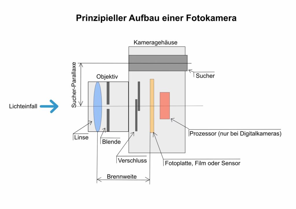 - Licht fällt durch das Objektiv und die Blende auf den Sensor oder Film.