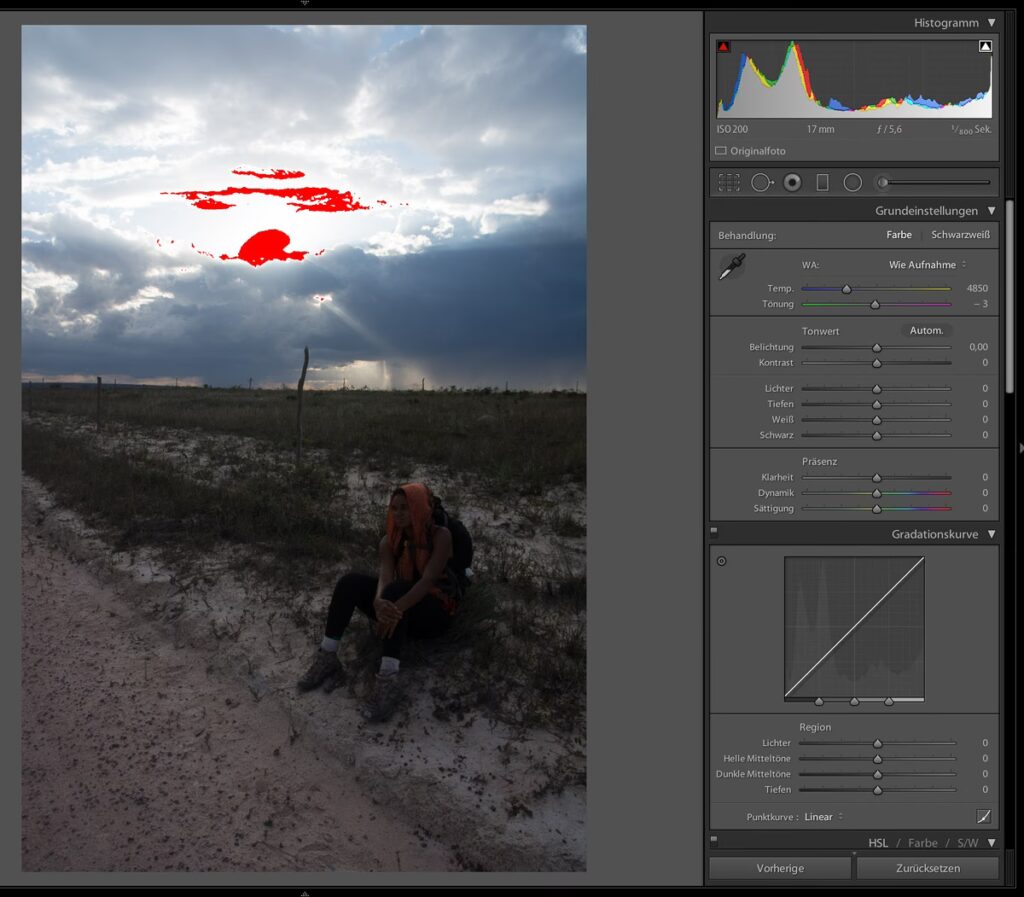 Manchmal ist nur ein Teil des Bildes zu dunkel, z.B. ein Vordergrund oder ein Gesicht. In solchen Fällen sind globale Anpassungen wie der Belichtungsregler nicht ideal, da sie das gesamte Bild beeinflussen würden. Nutzen Sie stattdessen die lokalen Anpassungswerkzeuge: