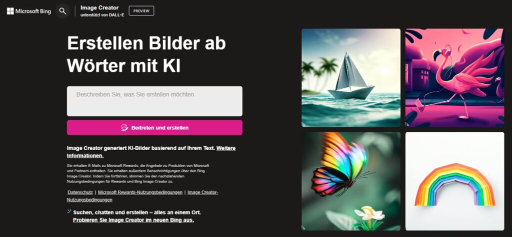 Bing als Suchmaschine kann Bilder suchen und finden. Der Bing Image Creator (Image Creator von Microsoft Designer) ist jedoch ein separates Tool, das aktiv neue Bilder basierend auf Ihren Textbeschreibungen mithilfe von KI (DALL-E 3) erstellt.
