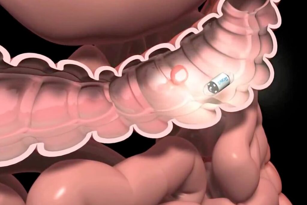 Damit ist in der Regel die Kapselendoskopie gemeint, bei der eine winzige Kamera-Kapsel geschluckt wird, die auf ihrem Weg durch den Verdauungstrakt Bilder aufzeichnet.