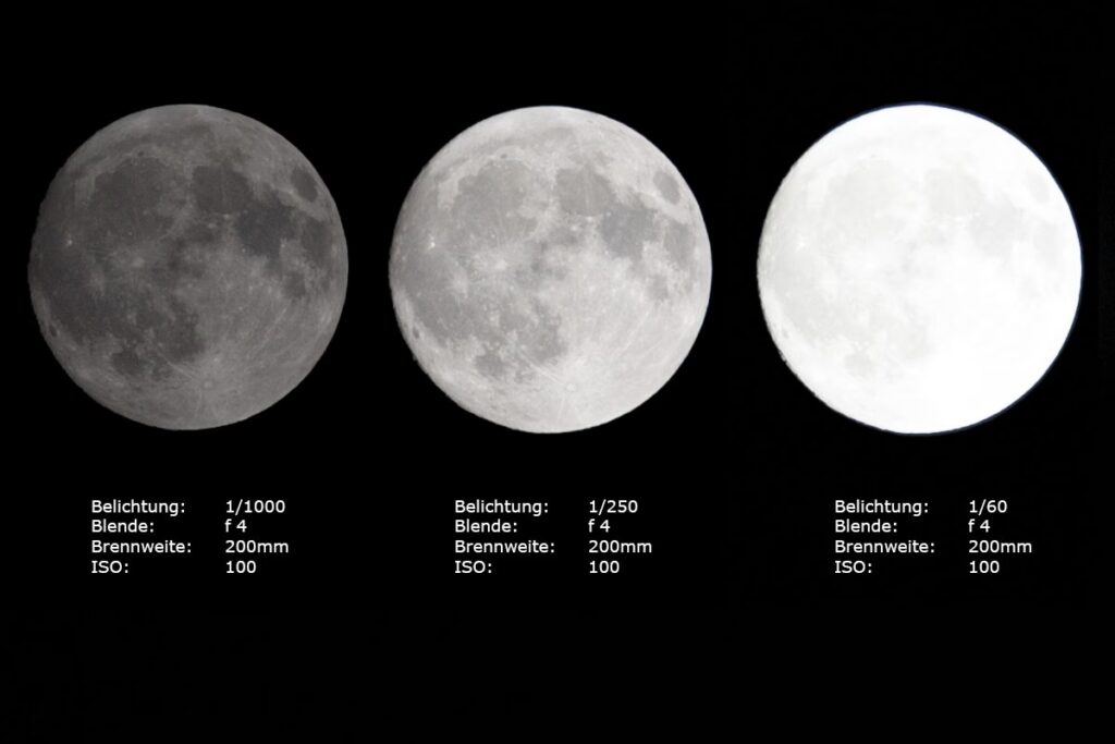 Die Verschlusszeit bestimmt, wie lange der Sensor Licht empfängt. Hier gibt es eine Besonderheit: Obwohl es Nacht ist, ist der Mond ein sehr helles Objekt, das von der Sonne angestrahlt wird. Lange Belichtungszeiten, wie man sie für Sterne oder die Milchstraße verwendet, sind für den Mond selbst nicht nötig und würden ihn überbelichten. Hinzu kommt, dass der Mond sich relativ schnell über den Himmel bewegt (scheinbare Bewegung durch die Erdrotation). Bei langen Brennweiten wird diese Bewegung schnell sichtbar und führt zu Bewegungsunschärfe, wenn die Verschlusszeit zu lang ist.
