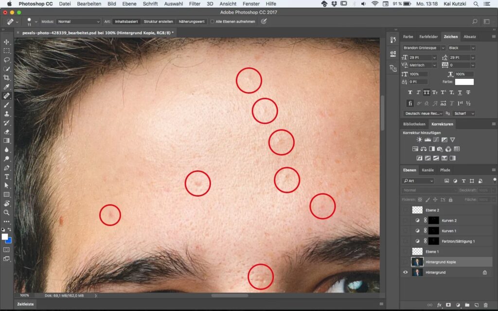 Sollte ich Anpassungen an Farbe und Belichtung vor oder nach der Retusche von Makeln vornehmen?