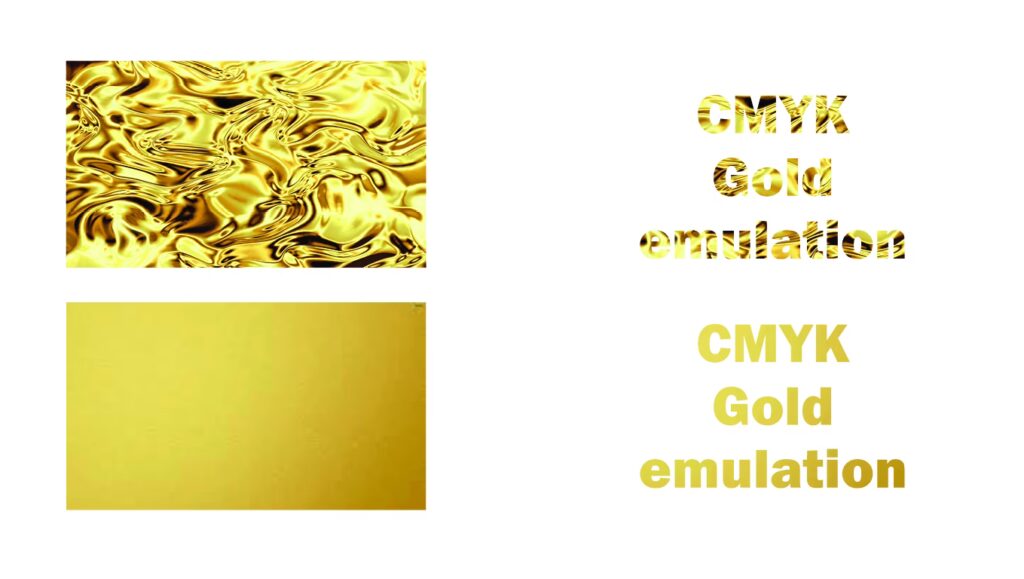Die Simulation von Gold im CMYK-Druck basiert auf der geschickten Mischung der Prozessfarben Cyan, Magenta, Yellow und Key (Schwarz). Ziel ist es, eine Farbkombination zu finden, die visuell dem Gold am nächsten kommt und durch den Einsatz von Techniken wie Farbverläufen den Eindruck von Tiefe und Glanz erweckt, ähnlich der Art und Weise, wie Licht von einer goldenen Oberfläche reflektiert wird.