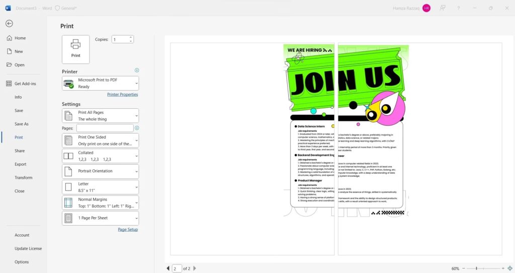 - Fahren Sie mit der Maus über „Drucken“ und klicken Sie auf den kleinen Pfeil, der sich rechts daneben befindet.