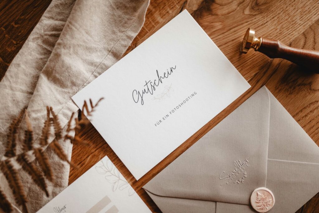 Ein physischer Geschenkgutschein ist oft eine schöne Ergänzung zum Geschenk selbst. Etwas Greifbares, das man liebevoll verpacken und überreichen kann. Fragen Sie den Fotografen, ob er professionell gestaltete Gutscheine anbietet. Klären Sie, ob der Gutschein auf einen bestimmten Betrag oder ein bestimmtes Shooting-Paket ausgestellt wird. Stellen Sie sicher, dass Sie den Gutschein rechtzeitig vor dem Anlass (Geburtstag, Weihnachten etc.) erhalten.
