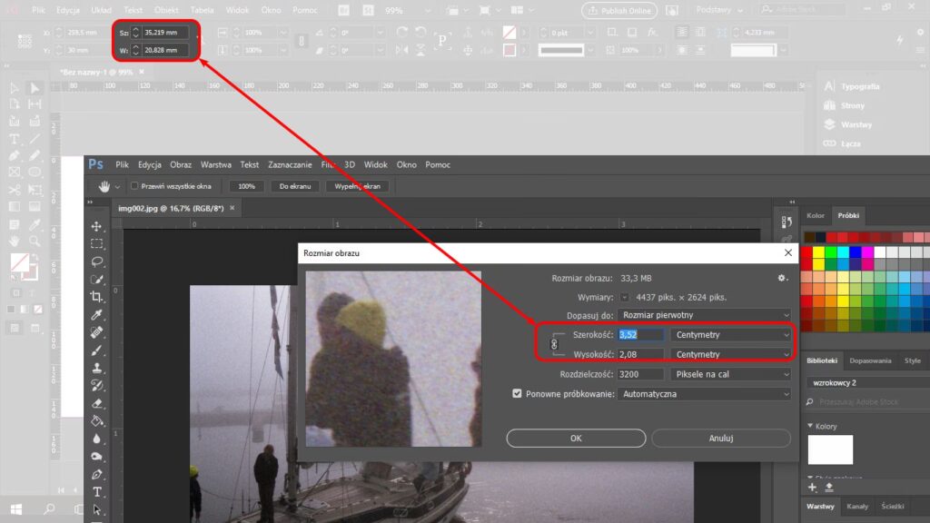 - In der Kontrollleiste sehen Sie Felder für Breite (W) und Höhe (H) sowie Skalierungsprozentsätze.