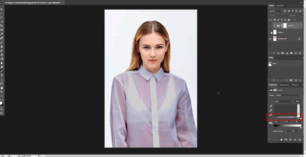 - Experimentieren Sie im Eigenschaften-Bedienfeld der Tonwertkorrektur mit den Schiebereglern für die Ein- und Ausgabewerte, um das Kleidungsstück heller und transparenter erscheinen zu lassen.
