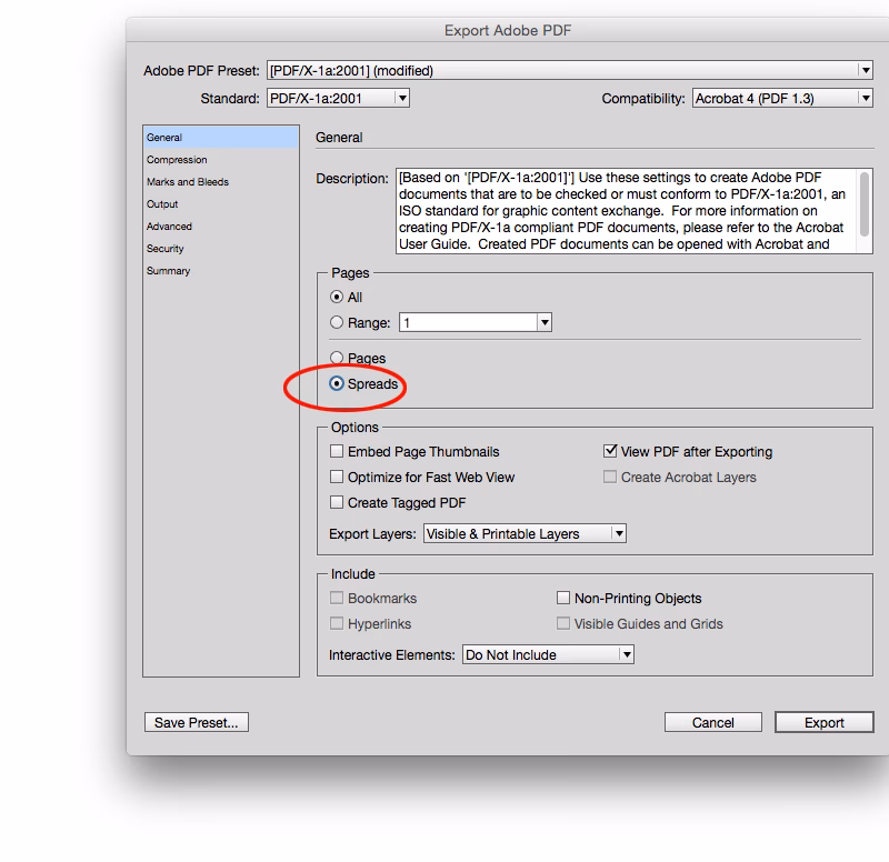 - PDF speichern: Überprüfen Sie die Einstellungen im Dialogfenster. In der Regel sind mit der Auswahl des PDF/X-1a:2001-Standards die notwendigen Kompatibilitäts- und Ausgabeeinstellungen korrekt gesetzt. Klicken Sie abschließend auf