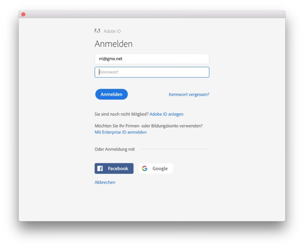 - Mit Ihrer E-Mail-Adresse und Ihrem Kennwort: Geben Sie die E-Mail-Adresse und das Kennwort ein, die Sie bei der Erstellung Ihres Adobe-Kontos verwendet haben.