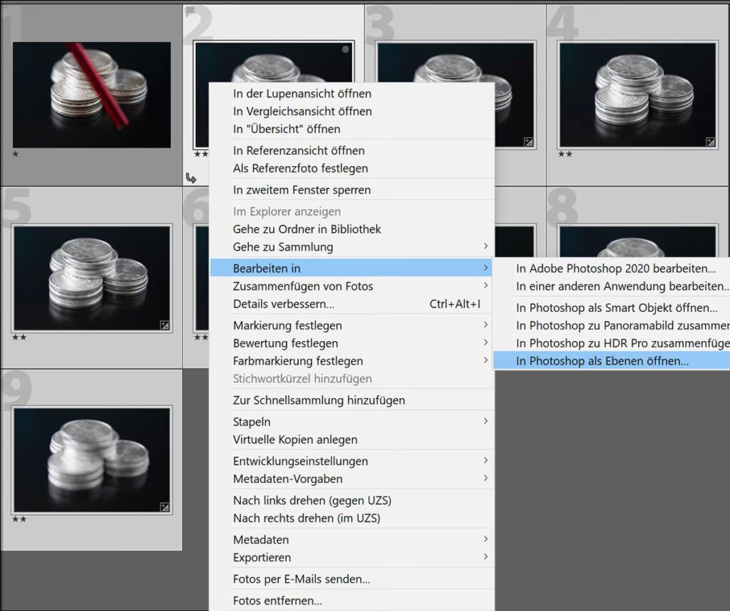 - Auswählen der Bilder: Wählen Sie die zusammengehörigen Aufnahmen der Belichtungsreihe aus.