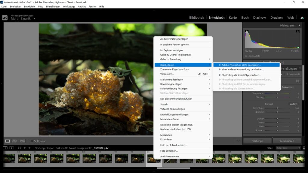 Wenn Sie in Lightroom ein Bild auswählen (z. B. eine Rohdatei, ein TIFF oder ein JPEG) und "Foto > Bearbeiten in > Adobe Photoshop" wählen, erstellt Lightroom standardmäßig eine Kopie des Bildes in einem Format, das für die Bearbeitung in Photoshop optimiert ist. Für Rohdateien ist dies meist ein 16-Bit-TIFF oder, je nach Ihren Einstellungen, ein 16-Bit-PSD. Diese Kopie wird dann in Photoshop geöffnet.