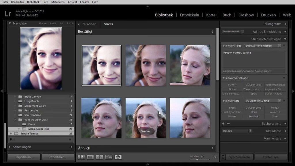 - Schnelles Wiederfinden von Personen: Dies ist der offensichtlichste Vorteil. Anstatt manuell Alben oder Ordner durchsuchen zu müssen, können Sie einfach nach einem Namen suchen und Lightroom Classic zeigt Ihnen alle Fotos, auf denen diese Person erkannt und benannt wurde.