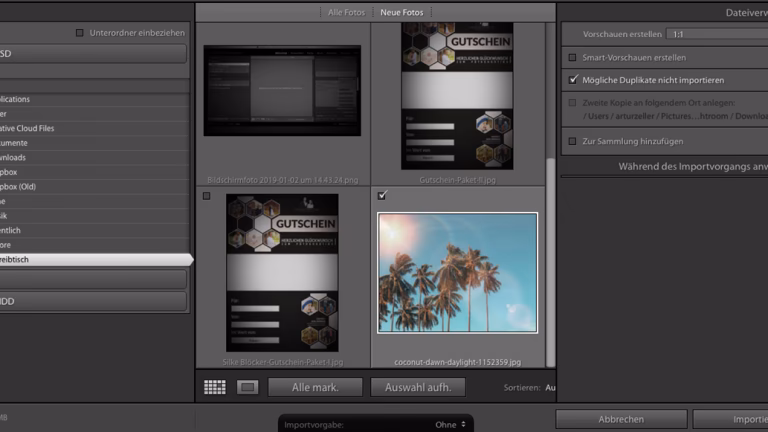 - In der Mitte des Fensters siehst du eine Vorschau der Fotos, die sich in der ausgewählten Quelle befinden. Hier kannst du auswählen, welche Bilder importiert werden sollen. Standardmäßig sind oft alle Bilder ausgewählt. Du kannst einzelne Bilder durch Anklicken der Häkchen unterhalb des Bildes abwählen oder über die Optionen alle auswählen oder abwählen.
