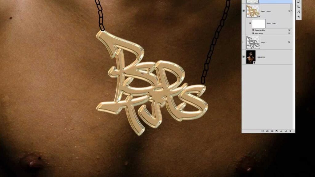 Nehmen Sie sich Zeit für diesen Schritt. Zoomen Sie heran und passen Sie die Größe, Position, Drehung und Verkrümmung sorgfältig an, bis die Halskette realistisch auf dem Model sitzt.