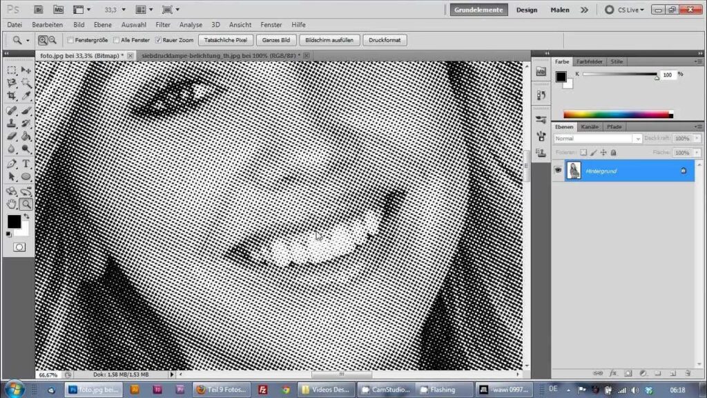 - Graustufen: Graustufen sind bei pixelbasierten Vorlagen für den Siebdruck tabu (es sei denn, Sie arbeiten bewusst mit Rastern, was aber ein fortgeschrittenes Thema ist). Die Vorlage darf am Ende nur reine schwarze und reine weiße Elemente enthalten.