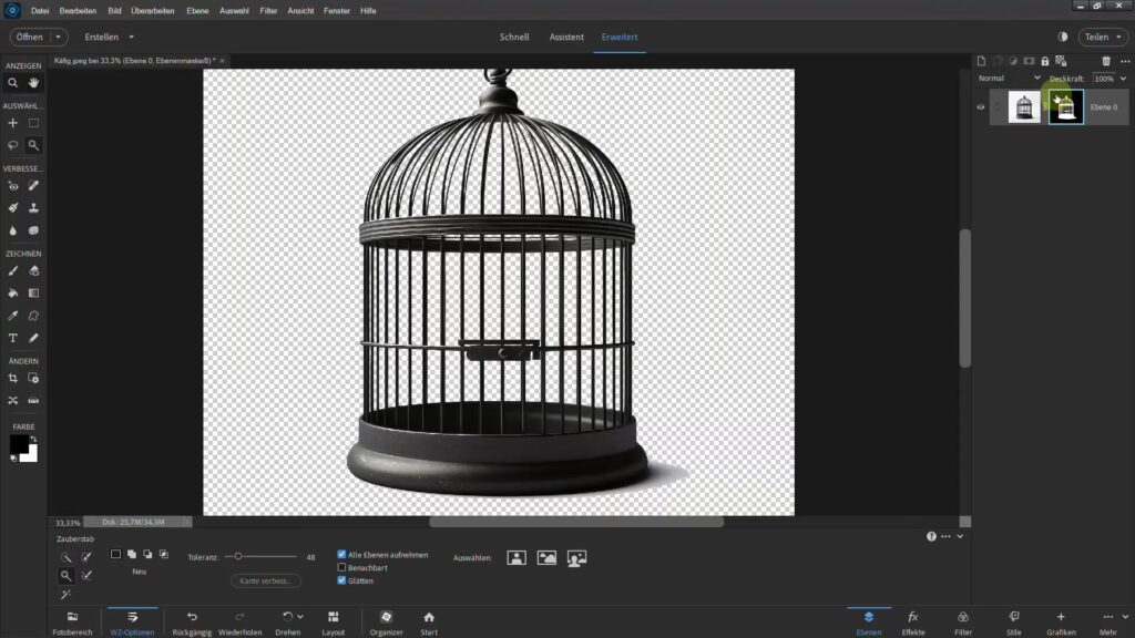 Schnellauswahl-WerkzeugFarbsimilarität & Kanten (pinseln)Mittel bis hochMittelBereiche mit klar definierten Kanten, Objekte