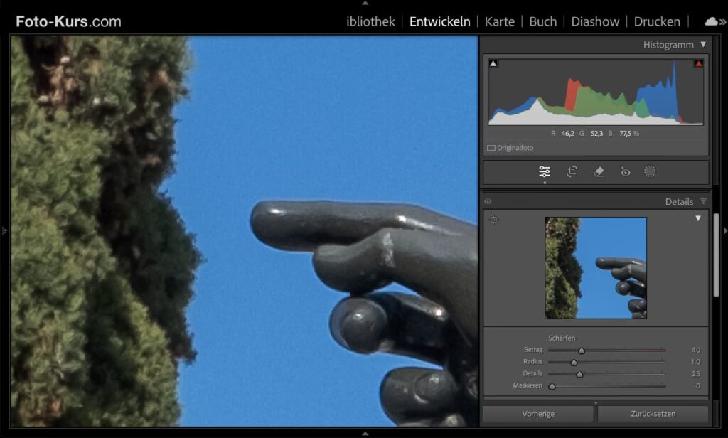 Digitale Sensoren erfassen Licht, aber nicht immer mit perfekter Schärfe. Das Werkzeug zum Schärfen in Lightroom betont Kanten und Konturen im Bild, um die wahrgenommene Schärfe zu erhöhen. Es ist ein entscheidender Schritt, um Details hervorzuheben und das Bild knackiger wirken zu lassen. Allerdings muss es behutsam eingesetzt werden, um unnatürliche Halos oder Artefakte zu vermeiden.