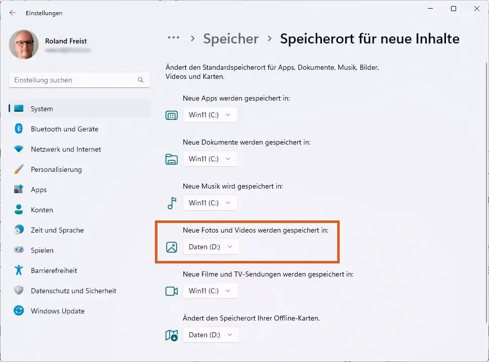 - Ändern Sie den Speicherort für Fotos und Videos: Suchen Sie den Eintrag „Neue Fotos und Videos werden gespeichert in“. Darunter sehen Sie das aktuell ausgewählte Laufwerk.