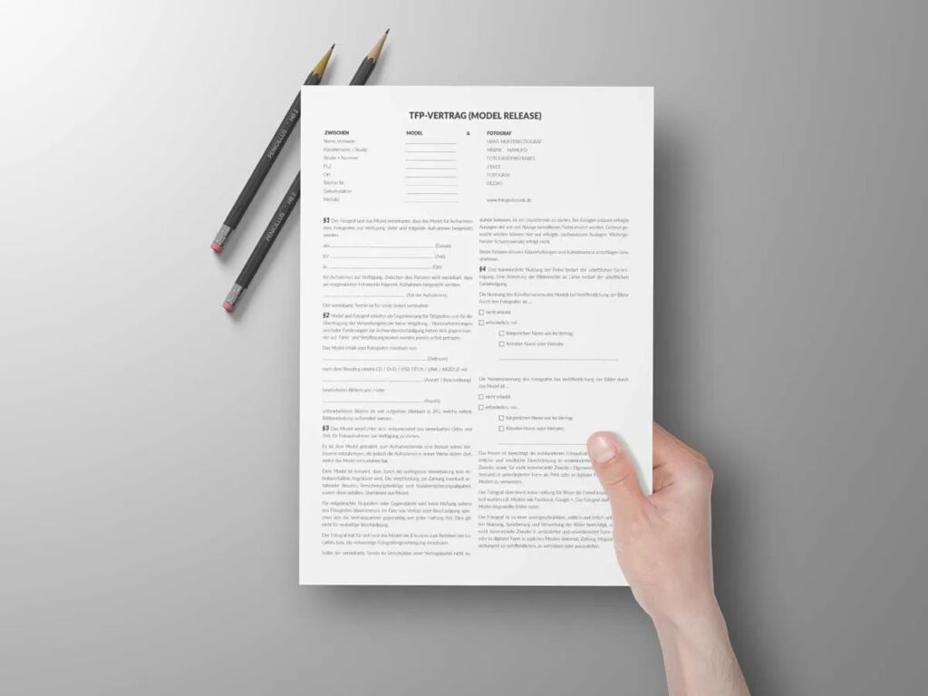- Model Release: Eine ausdrückliche Zustimmung des Modells, dass der Fotograf Bilder, auf denen es abgebildet ist, für die im Vertrag genannten Zwecke verwenden darf. Dies ist rechtlich essenziell.