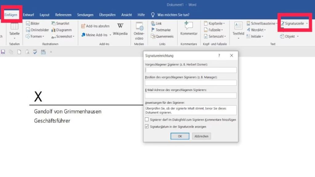 Word bietet auch die Möglichkeit, eine spezielle Signaturzeile einzufügen. Dies ist ein Platzhalter, der anzeigt, wo eine Unterschrift erfolgen soll, und der später digital signiert werden kann.