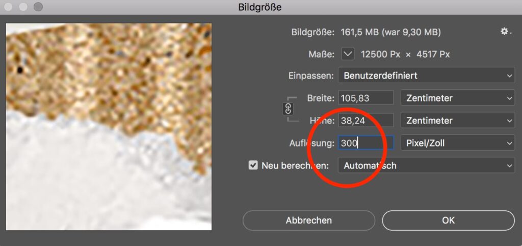 Sie können die ppi-Zahl in einem Bildbearbeitungsprogramm ändern, aber das „Hinzufügen“ von Pixelinformationen („Upsampling“ mit aktivierter „Bild neu berechnen“ Option) führt in der Regel nicht zu mehr Details oder Schärfe. Die Software „erfindet“ die zusätzlichen Pixel basierend auf den vorhandenen, was oft zu einem weichgezeichneten oder unscharfen Ergebnis führt. Es ist immer besser, mit einem Bild zu beginnen, das die benötigte hohe Auflösung bereits besitzt.