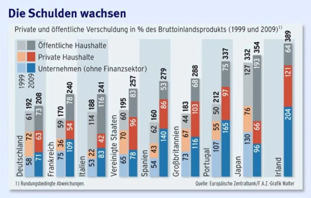 - Inflation: Eine Notenbank könnte versuchen, Schulden durch Inflation „wegzuinflationieren“, indem sie die Geldmenie erhöht und Staatsanleihen kauft. Geldentwertung begünstigt tendenziell den Schuldner (Staat), birgt aber erhebliche Risiken für die Wirtschaft und die Ersparnisse der Bürger.