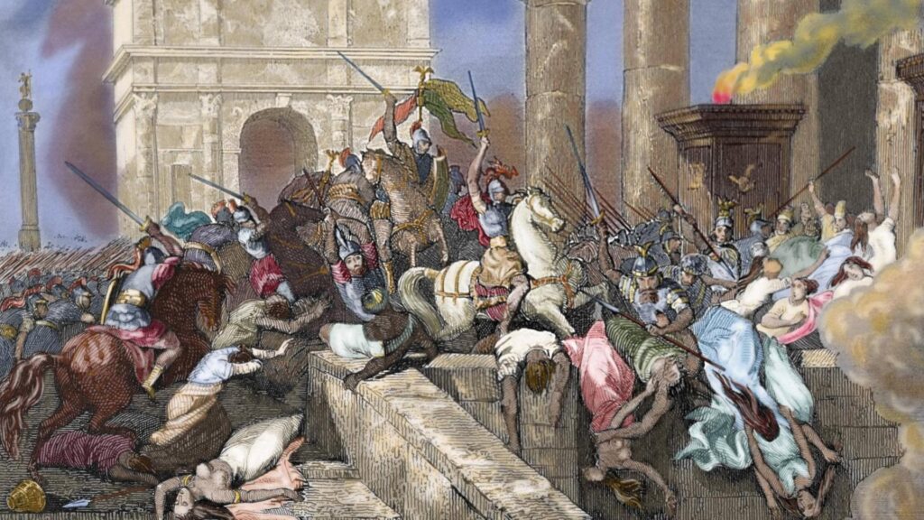 Obwohl Rom einen fragilen Frieden mit den Goten aushandelte, hielt dieser nicht lange. Im Jahr 410 n. Chr. plünderte der westgotische König Alarich die Stadt Rom selbst – ein Ereignis, das weltweit Schockwellen auslöste und die Unbesiegbarkeit Roms endgültig widerlegte. Die folgenden Jahrzehnte waren geprägt von ständiger Bedrohung und weiteren Invasionen. Die Vandalen eroberten 455 n. Chr. erneut Rom und plünderten es. Diese wiederholten Schläge schwächten das Weströmische Reich militärisch, wirtschaftlich und moralisch. Der Höhepunkt dieser Entwicklung war das Jahr 476 n. Chr., als der germanische Offizier Odoaker den letzten weströmischen Kaiser, den jungen Romulus Augustus, absetzte. Odoaker regierte danach selbst über Italien, sandte jedoch die kaiserlichen Insignien nach Konstantinopel. Für viele Historiker markiert die Absetzung des letzten Kaisers das formale Ende des Weströmischen Reiches.