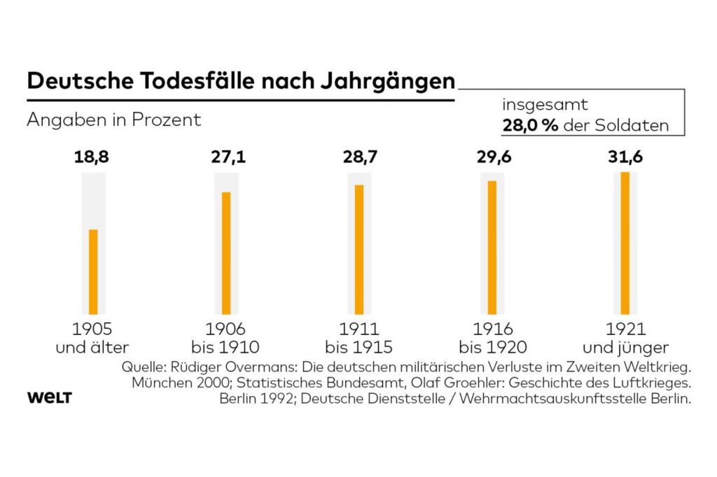 Die direkten militärischen Verluste Deutschlands im Zweiten Weltkrieg waren immens. Von den über 17 Millionen Wehrmachtssoldaten deutscher und nichtdeutscher Herkunft, die zwischen 1939 und der deutschen Kapitulation am 8. Mai 1945 eingezogen wurden, kamen über 4,7 Millionen ums Leben. Diese Zahl umfasst Gefallene, Vermisste und in Kriegsgefangenschaft Verstorbene. Der Blutzoll war so hoch, dass nahezu jede Familie im Deutschen Reich einen Toten oder Vermissten zu beklagen hatte.