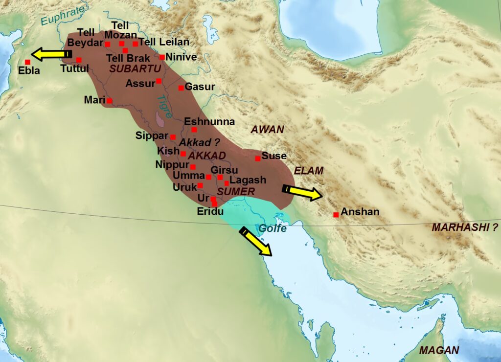 Um 2340 v. Chr. eroberten die Akkader unter Sargon Sumer und errichteten ein Reich, das sich über die meisten sumerischen Stadtstaaten erstreckte. Nach dem endgültigen Niedergang der sumerischen Zivilisation um 2000 v. Chr. stand das Gebiet für Jahrhunderte unter der ausschließlichen Kontrolle semitischer Völker.
